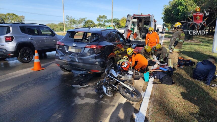 Nesta quinta-feira (12), um acidente entre uma moto e um carro deixou duas pessoas feridas na DF-004. As vítimas, o motociclista e a garupa, se queixaram de dores. A jovem de 19 anos foi levada ao Hospital de Base enquanto o outro recusou transporte.