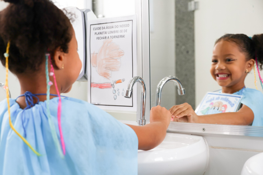 A guardiã Louise Lima dos Santos, de 4 anos, compartilhou o que aprendeu durante a semana e como tem aplicado esses ensinamentos na escola e em casa. “Eu escovo os dentes com a torneira fechada”, explicou a estudante.