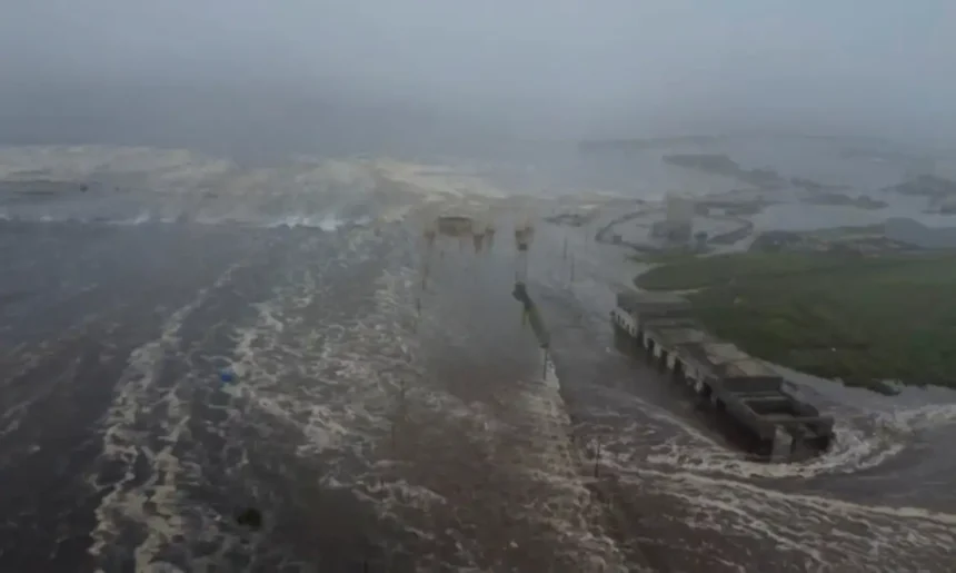Imagens verificadas de drones mostraram que toda a costa da cidade estava submersa, com prédios mais altos e algumas instalações de armazenamento cercadas pela água.