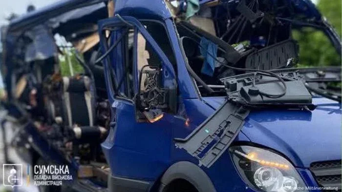 De acordo com Kobzar, um drone inimigo atingiu um ônibus perto de Bilopillia, ferindo também sete pessoas, quatro delas em estado grave. O veículo estava levando civis que saíam da linha de frente da guerra, e se encontrava em uma área a cerca de 10 quilômetros da fronteira com a Rússia.