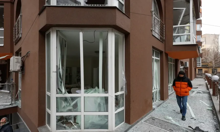 No bairro de Solomianskyi, na capital, um drone russo bateu na lateral de um prédio de apartamentos, deixando um buraco aberto e marcas de queimadura, segundo um fotógrafo da Reuters que estava no local.