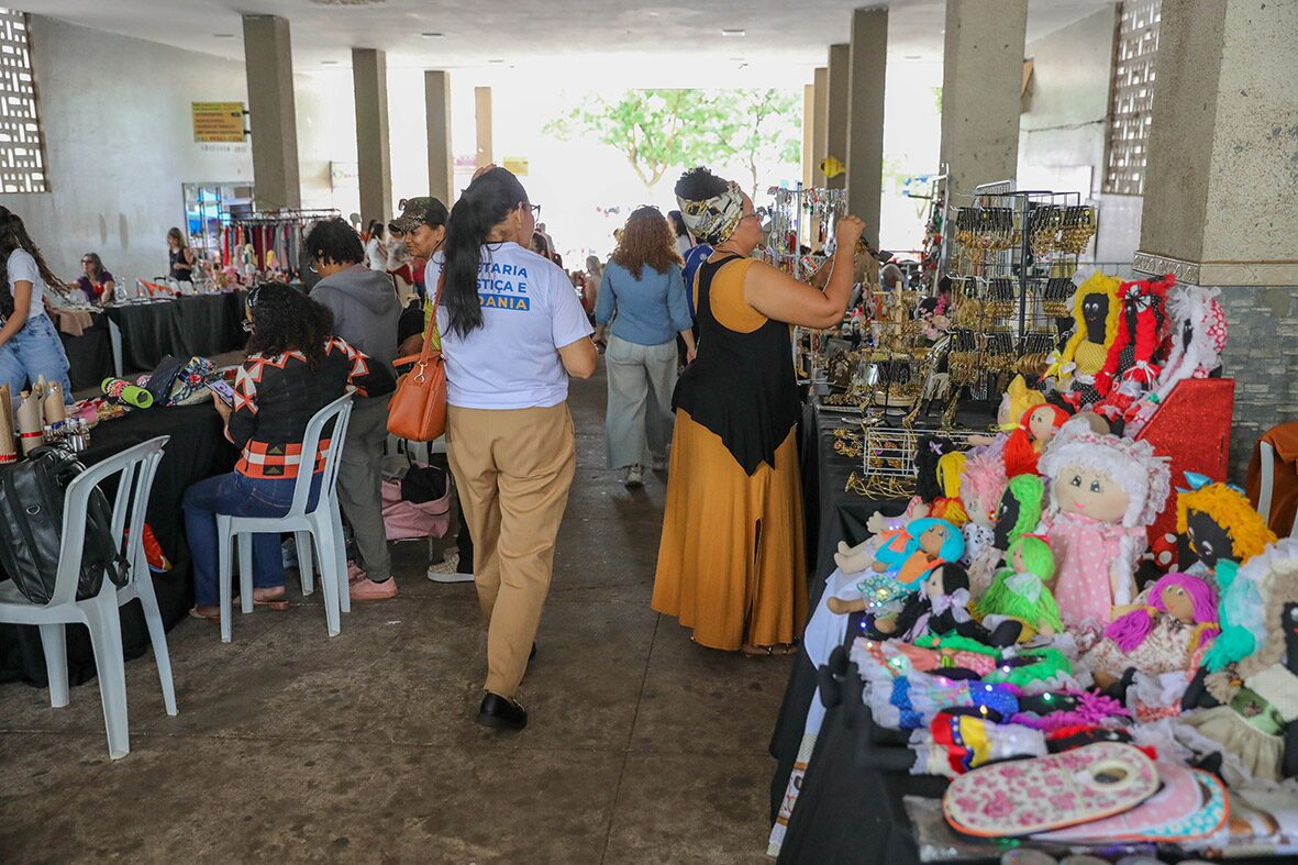 Entre terça (3) e esta quinta (5), em parceria com a prefeitura do Setor Comercial Sul (SCS), a Sejus reuniu cerca de 200 artesãs para a comercialização de produtos na passarela central do SCS no Vila Banco de Talentos, um espaço de exposição e venda de produtos personalizados por artesãs que realizaram oficinas e aulas nos núcleos do programa Direito Delas, que tem o objetivo de oferecer atendimentos social, psicológico e jurídico às vítimas diretas de violência.