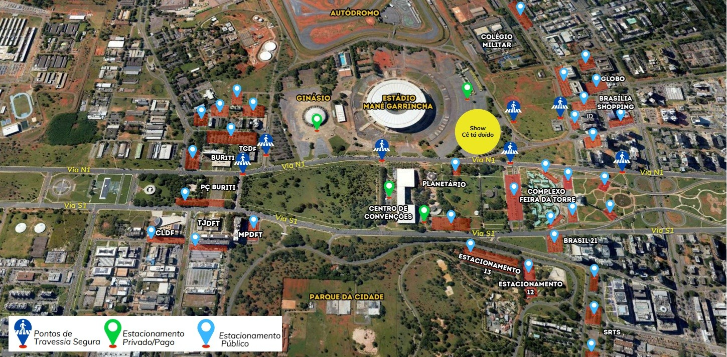 Além do estacionamento privado, os motoristas poderão utilizar vagas públicas na Feira da Torre, no Clube do Choro, no Planetário, no Parque da Cidade, no Brasil 21 e nas proximidades do Palácio do Buriti. Na Asa Norte, próximo ao Shopping ID, também há áreas disponíveis. Na entrada principal da Arena Mané Garrincha, haverá espaço reservado para táxis.