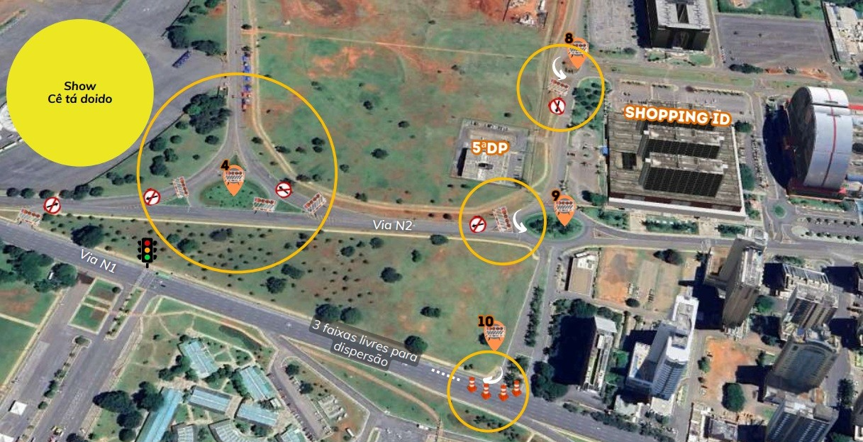 Na via N2, nas proximidades da rotatória da 5ª Delegacia de Polícia, haverá interdições para direcionar o fluxo à via N1. Também será implantada sinalização na rotatória próxima ao Shopping ID, orientando o tráfego para a via W3 Norte. A previsão é que a dispersão seja concluída até as 22h.