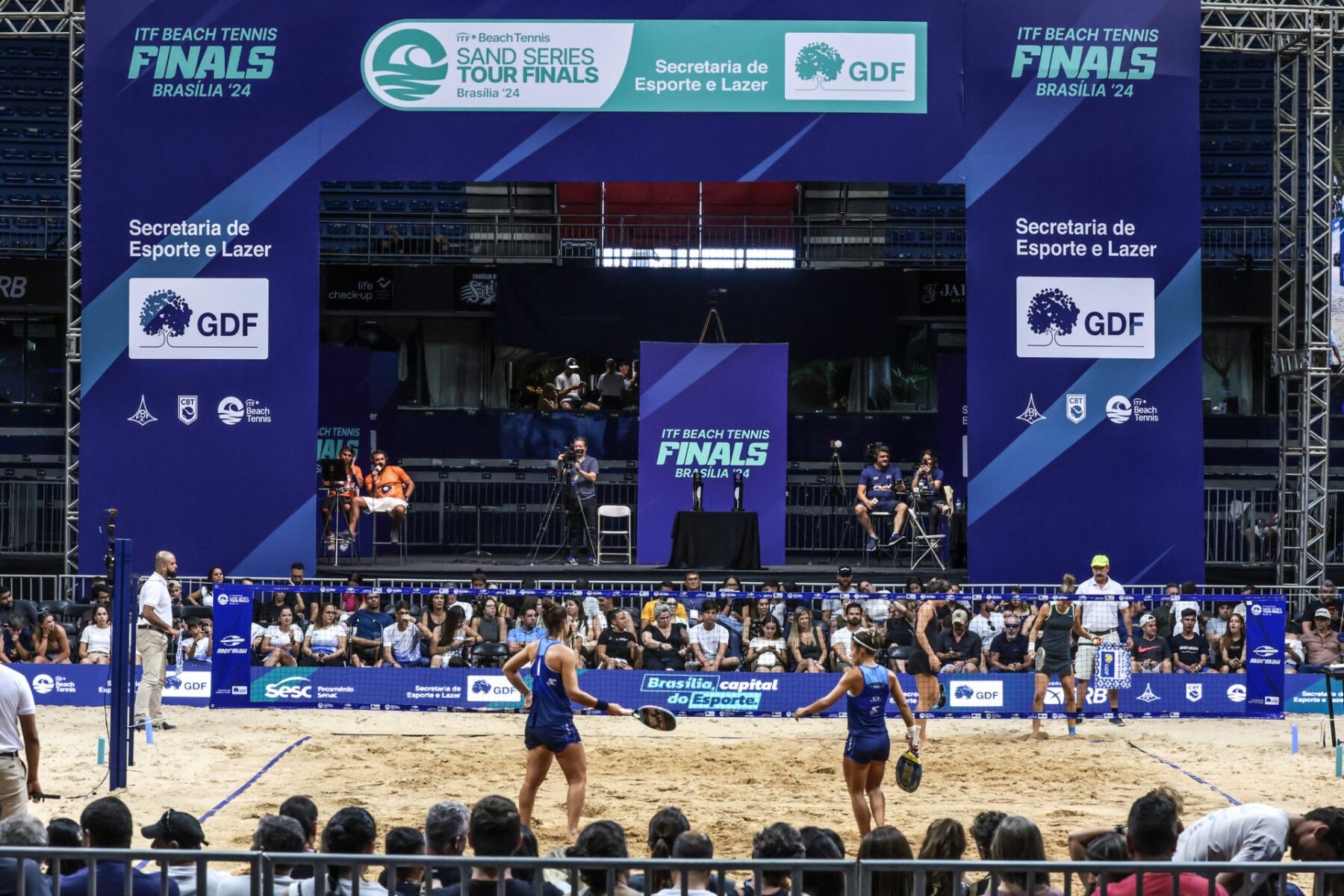 Os campeões da primeira edição do ITF Beach Tennis Finals serão conhecidos neste sábado (7), na Arena BRB Nilson Nelson, em Brasília. No feminino, a partir das 18h, Rafaella Miiller e a venezuelana Patty Diaz enfrentam as italianas Giulia Gasparri e Ninny Valentini. A seguir, não antes das 20h, o francês Nicolas Gianotti e o italiano Mattia Spoto e Leonardo Branco e Allan Oliveira disputam o título masculino. O torneio inédito distribui uma premiação total de mais de US$ 100 mil, a maior da modalidade. Os jogos terão transmissão ao vivo pela ESPN 4 e pelo canal PlayBT no YouTube.