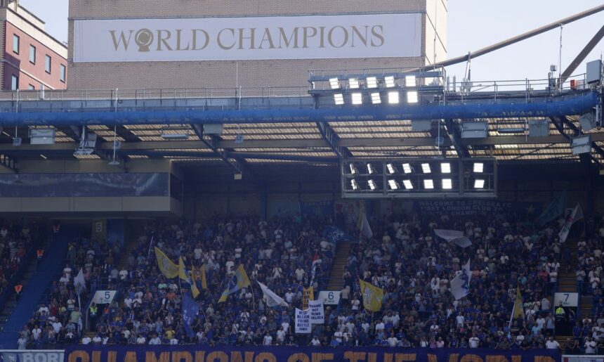 Uma enorme faixa saudando os “Campeões do Mundo” foi colocada no estádio Stamford Bridge antes da estreia do Chelsea na nova temporada europeia neste domingo (17), logo após o sucesso do clube inglês na Copa do Mundo de Clubes no mês passado.