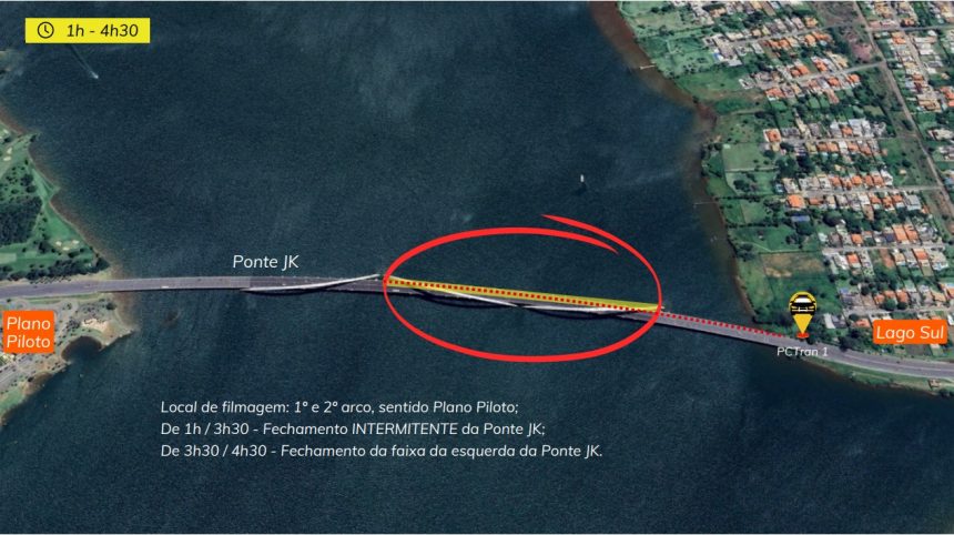 Entre a 1h e as 3h30, os agentes do Detran farão a interdição intermitente da via, sentido Plano Piloto, da cabeceira da Ponte JK até o final do segundo arco. Já das 3h30 às 4h30, será fechada a faixa da esquerda da ponte. As equipes do Detran-DF utilizarão redutores de velocidade na via e farão o patrulhamento na região para garantir a segurança viária. A previsão é que o tráfego de veículos seja liberado às 4h30.