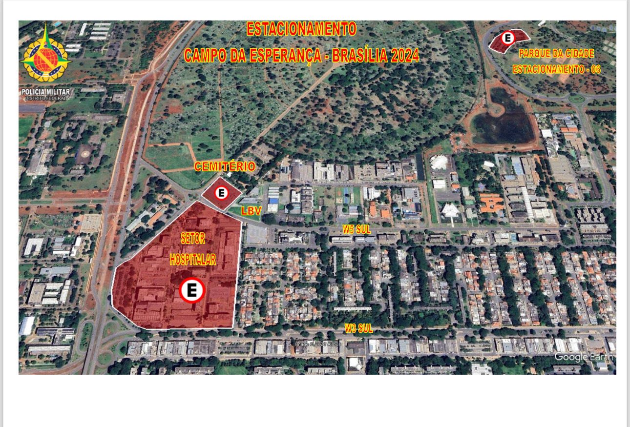 O estacionamento em frente ao Campo da Esperança será destinado às pessoas com deficiência (PcDs) e idosos. Para acessar o local será necessário apresentar as credenciais emitidas pelo Detran. Os demais condutores deverão utilizar, preferencialmente, o estacionamento 6 do Parque da Cidade. Haverá policiais militares atuando para contribuir com a travessia dos pedestres.