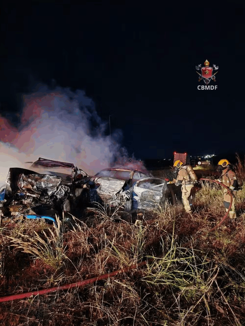 Uma colisão entre dois carros seguida de incêndio matou dois homens na madrugada desta sábado (12), na DF-180. O acidente aconteceu por volta das 4h, na divisa entre as regiões de Vendinha e Brazlândia.