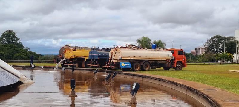 Após a limpeza, que incluiu remoção de possíveis criadouros do mosquito da dengue, caminhões-pipa preencheram o espelho-d’água até a altura dos fios dos refletores | Foto: GDF Presente