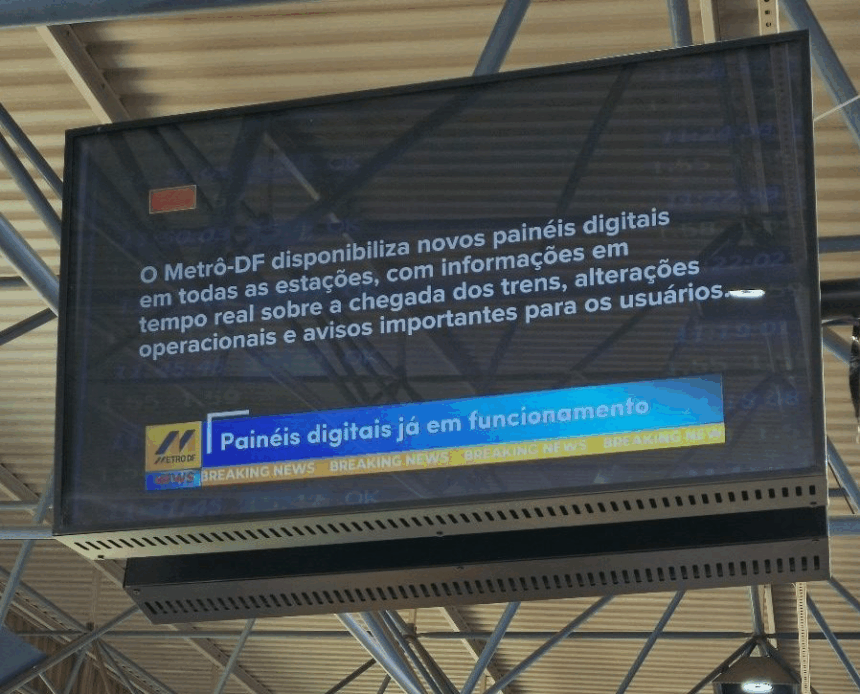 Instaladas em pontos estratégicos das estações, as telas permitem acompanhar com mais facilidade os horários dos trens, além de exibir vídeos institucionais, campanhas de utilidade pública e informações educativas e sociais do Metrô-DF e do Governo do Distrito Federal.