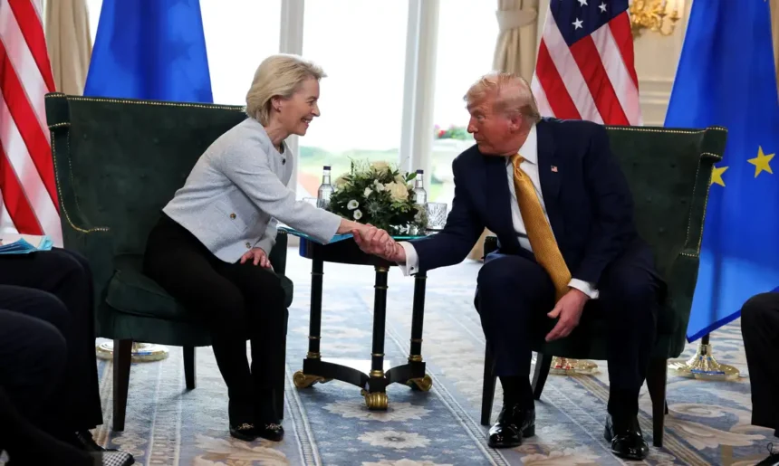A presidente da Comissão Europeia, Ursula von der Leyen, informou que o acordo prevê tarifas de 15% em todos os setores, afirmando que a medida deve ajudar a reequilibrar o comércio entre os dois grandes parceiros comerciais.