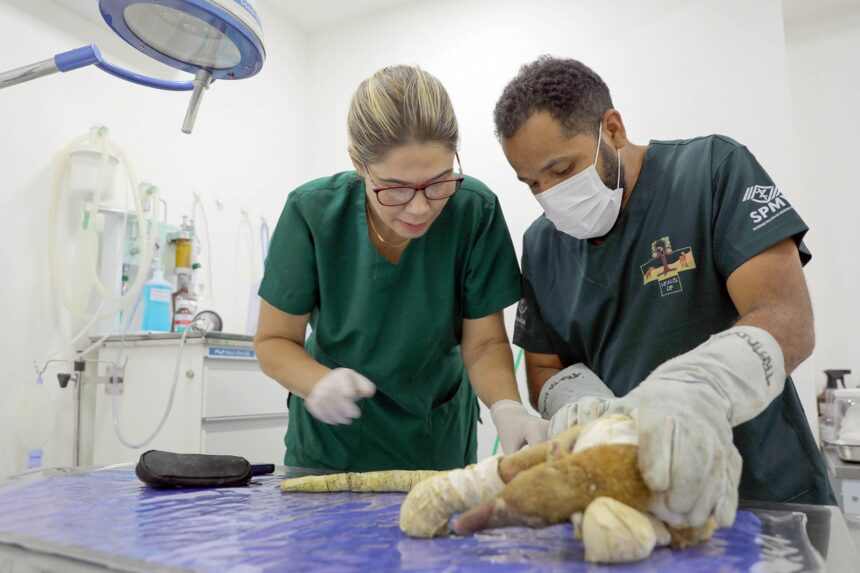 O profissional destaca, ainda, que os veterinários monitoram a hidratação e a temperatura corporal constantemente. No caso da tamanduá, o controle térmico é essencial, já que o metabolismo dela é mais lento, o que agrava o risco de hipotermia. O animal silvestre segue em observação contínua. “Ela ainda não está fora de risco. Mas nosso trabalho é garantir o máximo de conforto e vigilância”, afirma Thiago.