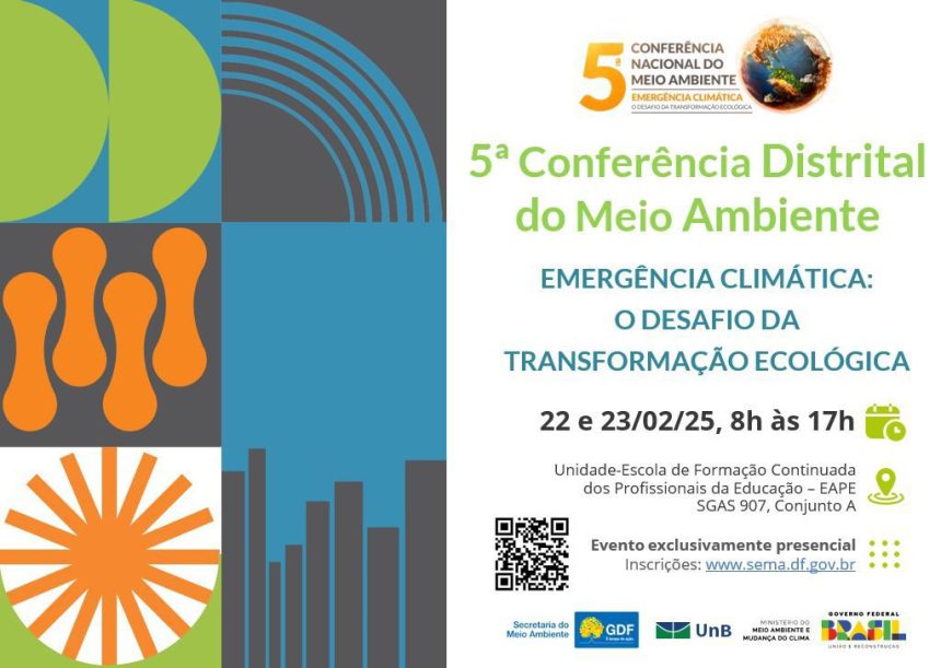 Coordenado pela Secretaria do Meio Ambiente (Sema-DF), a etapa distrital da conferência ocorre nos dias 22 e 23 deste mês, das 8h às 18h, na Unidade-Escola de Formação Continuada dos Profissionais da Educação (Eape), que fica no SGAS 907, Conjunto A.