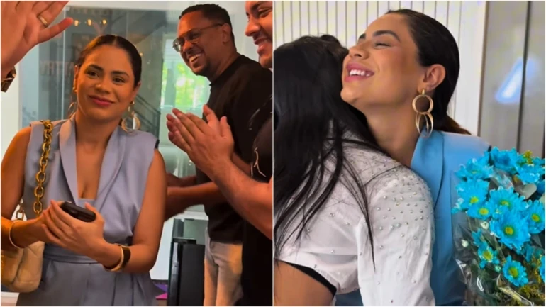 A artista foi recebida no escritório com uma surpresa preparada pelos colegas de trabalho. Sem conter o sorriso de gratidão, ela ganhou flores, abraços e uma declaração da mãe, Darlin Ferrattry.
