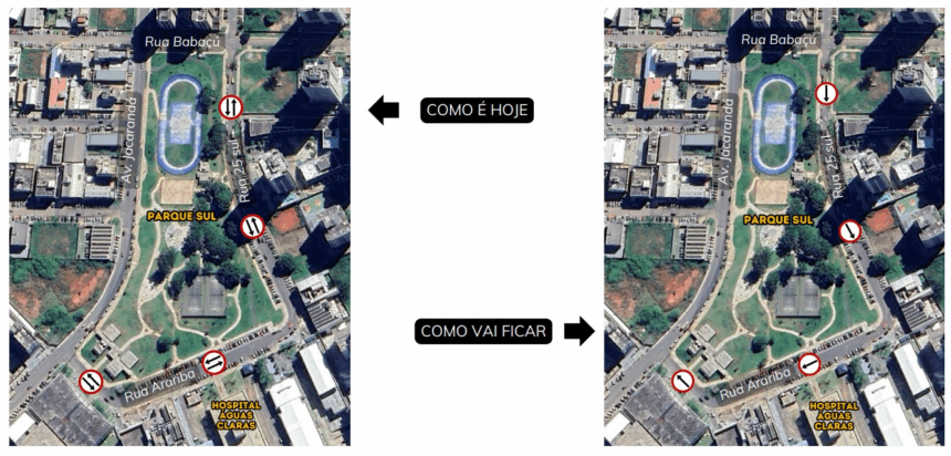 A implantação da sinalização vertical (marcas no solo) e horizontal (placas), que alteram para sentido único horário a circulação de veículos nas vias, começa na noite de quinta-feira (10), quando, a partir das 23h, os agentes farão intervenções no trânsito, impedindo que veículos que estiverem trafegando pela Avenida Jacarandá acessem a Rua Arariba. As equipes também colocarão cones na faixa direita da Rua Arariba, em frente ao Park Style, a fim de impedir que veículos estacionem ao longo do meio-fio.