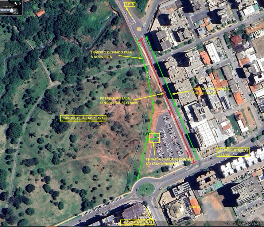 A partir deste sábado (22), o trânsito em Águas Claras sofrerá alterações devido à continuidade das obras complementares da terceira saída da cidade. A mudança se dará a partir das 10h para liberar a pista recém-construída da terceira saída da cidade, no trecho que dá acesso à Rua das Carnaúbas, contornando o estacionamento local.