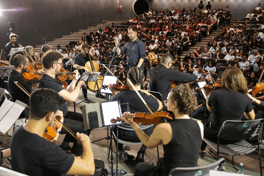 Para o aluno Felipe Telles, 16, o contato direto com os músicos e com os instrumentos oferece uma compreensão mais profunda do conteúdo. “É a minha primeira vez em uma orquestra, e está sendo muito gratificante, ainda mais porque já estamos trabalhando conteúdos que vão cair na prova. Ver tudo isso de perto torna o aprendizado muito mais concreto”, afirmou.