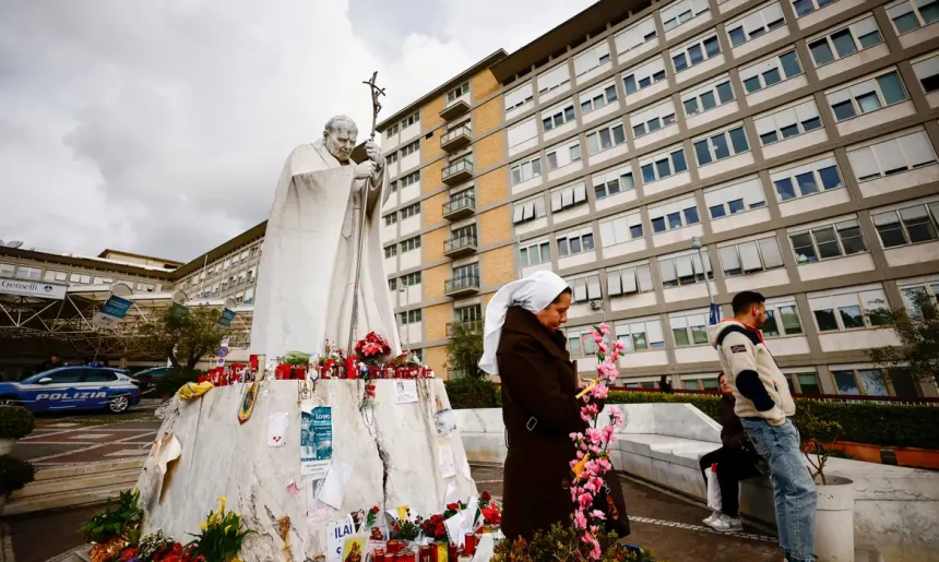 Francisco está internado no Hospital Gemelli, em Roma, há quase cinco semanas, devido a uma infecção respiratória grave que exigiu tratamento contínuo.