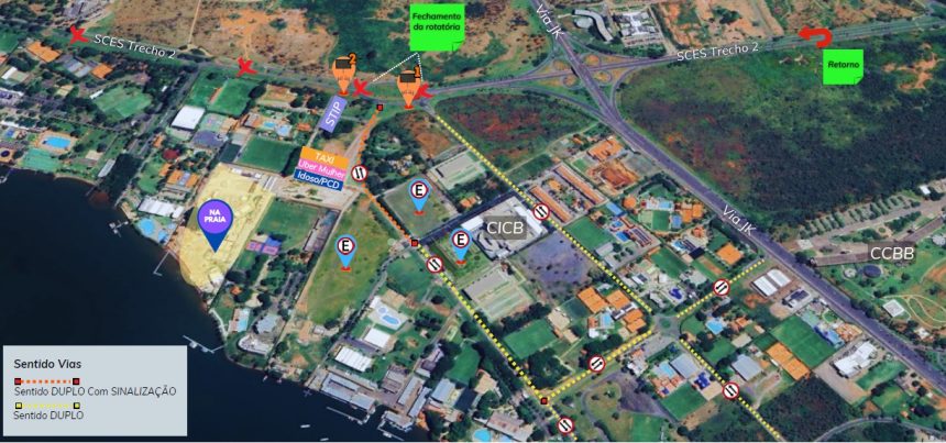 Neste sábado (22), em razão do evento Terapya do Henry, no Na Praia Parque, o Detran-DF vai alterar o trânsito da região do Setor de Clubes Esportivos Sul (SCES). A partir das 14h, na via SCES Trecho 2 será realizado o fechamento do primeiro retorno, no sentido norte-sul, e da rotatória de acesso ao evento. Os agentes de trânsito implantarão sinalização viária e utilizarão painéis eletrônicos de mensagens para orientar os condutores.