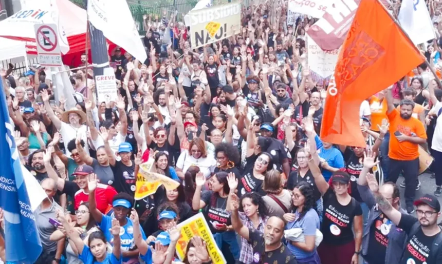 Os profissionais da educação decretaram greve na semana passada, após rejeitarem a proposta do governo municipal de reajuste anual de 2,6%, a partir de 1º de maio de 2025, e de 2,55%, a partir de 1º de maio de 2026.