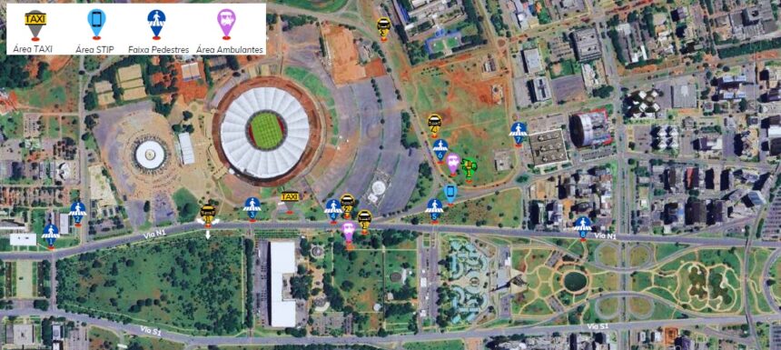 Na via N1, na altura do Planetário, e na via de contorno do estádio, os agentes de trânsito implantarão sinalização para a travessia de pedestres e para impedir o estacionamento irregular. Na via N2, na altura da rotatória de acesso à via de contorno do Mané Garrincha, será delimitada uma área de embarque para veículos de transporte por aplicativo. Já na entrada principal de automóveis, será sinalizada uma área destinada a táxis. O estacionamento do Planetário será reservado aos vendedores ambulantes.