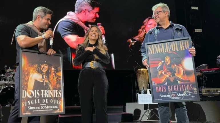 O sucesso de Simone Mendes segue ultrapassando fronteiras. A estrela sertaneja recebeu nesta sexta, 14, dois Discos de Ouro em Portugal, em celebração dos singles ‘Dois Fugitivos’ e ‘Dois Tristes’, cada um ultrapassando a marca de 1.250.000 streams no País.