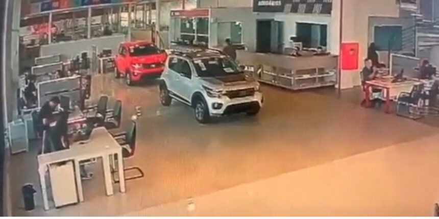 Em um dos registros das câmeras de segurança de uma concessionária, mostra o suspeito (blusa cinza) vagando pela loja ao passar pelos funcionários. Em outro segundo, ele aparece se escondendo. Confira a seguir:
