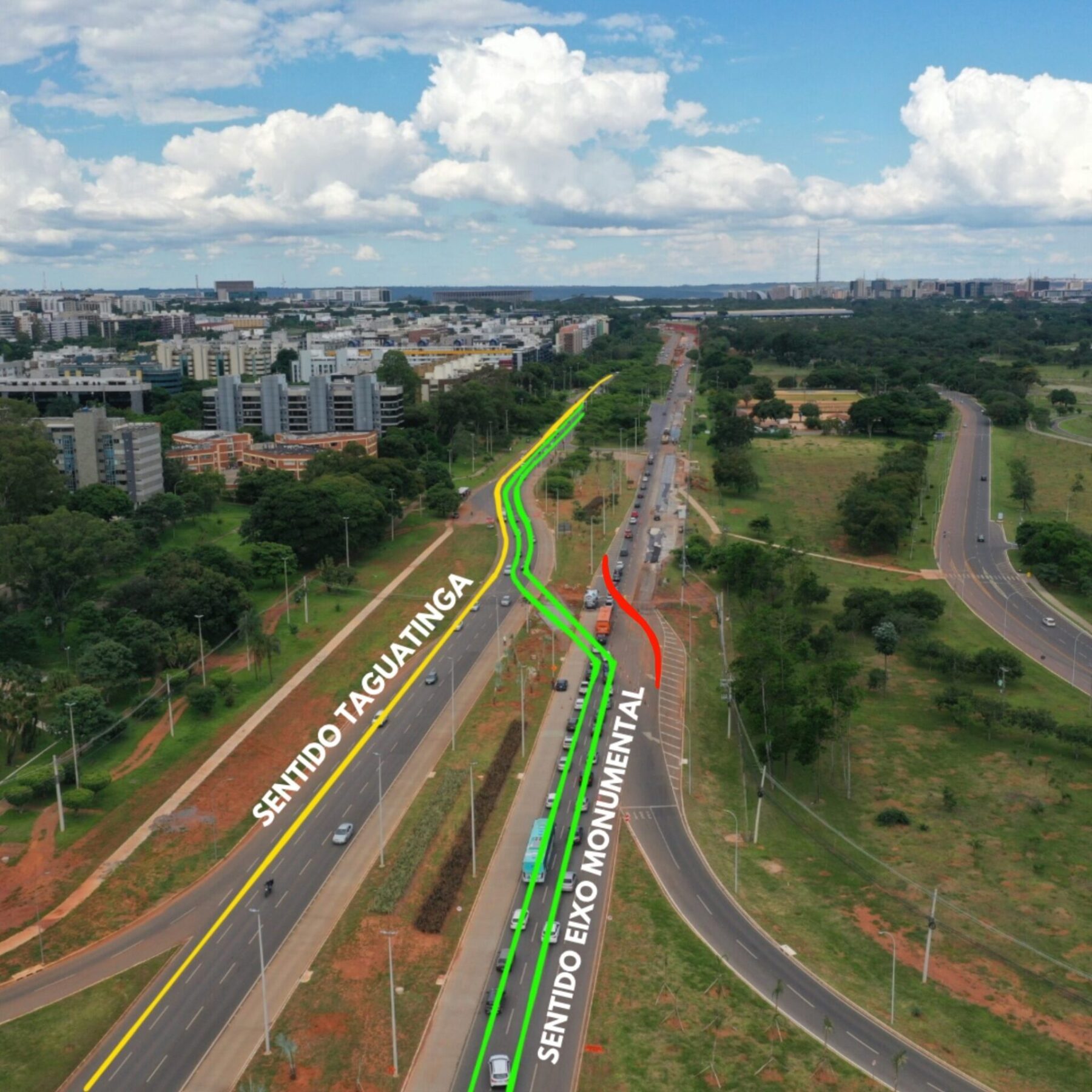 No sentido Eixo Monumental, a interdição completa da via começa logo após o viaduto Luiz Carlos Botelho Ferreira e se estende até a altura do posto de gasolina, na entrada do Setor de Indústrias Gráficas. Para manter o fluxo, duas faixas reversas serão colocadas em operação: a do meio e a da esquerda. No sentido Taguatinga, apenas a faixa mais à direita da via permanecerá liberada para o tráfego de veículos.