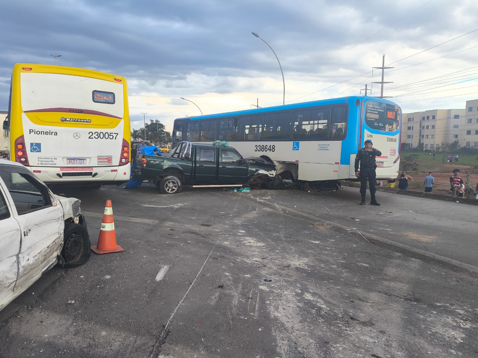 No caminho, os indivíduos atingiram um ônibus da linha 805.1. Na imagem divulgada pela corporação, mostra o veículo com a frente toda destruída após colidir na lateral do ônibus.