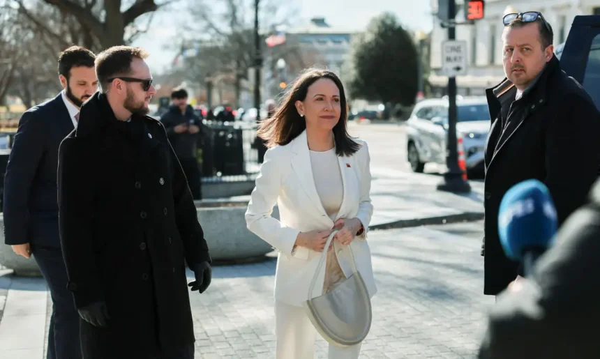 Machado, que fugiu da Venezuela em uma ousada fuga por via marítima em dezembro, disputa os ouvidos de Trump com membros do governo venezuelano e busca garantir um papel no futuro governo do país.