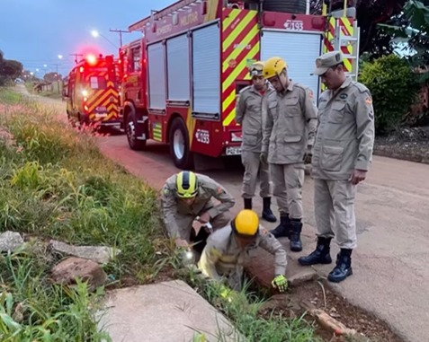 Um homem foi resgatado em uma rede de águas pluviais, na manhã desta segunda-feira (30), no bairro Santa Fé em Luziânia. A vítima, de 54 anos, ficou presa no local após ser agredida e jogada na rede por cinco homens.